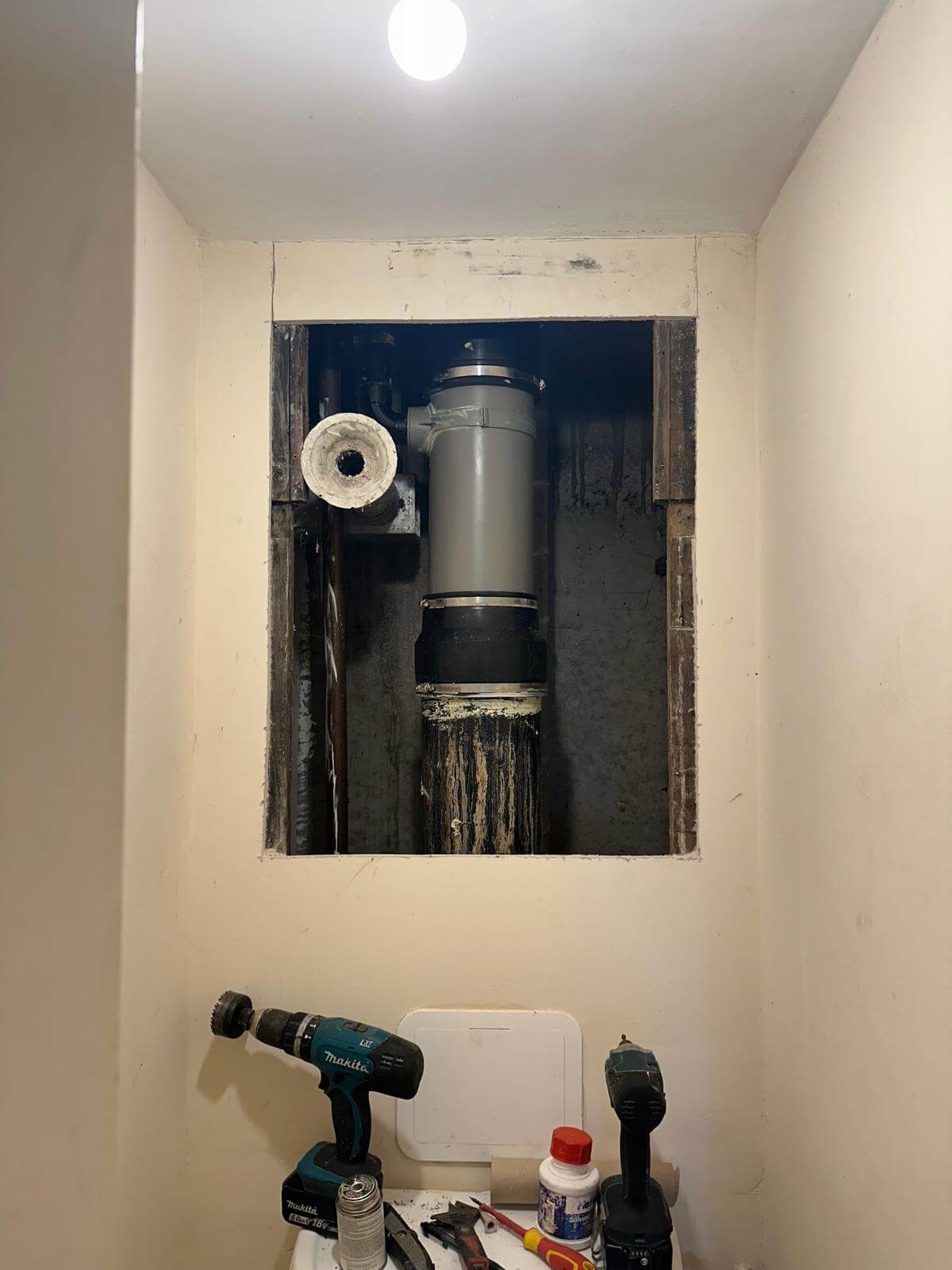 Our team carefully removed a section of the kitchen wall to access the problematic pipe joints, which had been installed in a nearly inaccessible area. We then removed the faulty connections, cleaned them thoroughly, and followed the pipe manufacturer’s guidance to rejoin the fittings correctly, using materials suited to the specific pipe type.